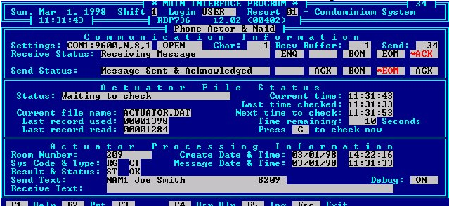 The workstation running the Phone Actuator Interface must be a 32-bit workstation with at least one serial port. Pervasive must be installed because the RDP DOS program will run the phone interface. The RDP interface computer connects with the phone switch using a null modem cable. Generally, the Phone Actuator and Maid Phone communicate using the same serial port, while Voicemail is a separate port from the phone switch. For more information, contact RDP Support.