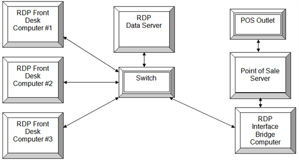 The workstation running the Point of Sale Interface must be a 32-bit workstation with a serial port. Pervasive must be installed because the RDP DOS program will run the point of sale interface. The RDP interface computer connects with the point of sale server using a null modem cable. For more information, contact RDP Support.