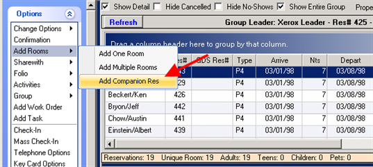 A companion reservation can be added to an existing reservation by selecting the Add Companion Res from the Add Rooms submenu under the Reservation Options.