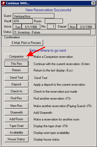 A companion reservation can be added to a new reservation immediately after the reservation has been saved by clicking the Companion or the alternative label button from the Continue With screen.