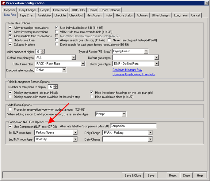The companion reservation feature is enabled from the New Res tab of the Reservation Configuration. To enable and configuration companion reservations: