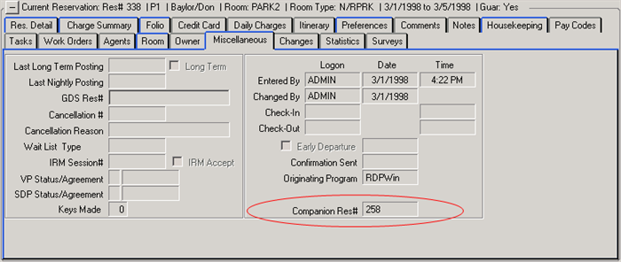 The Miscellaneous tab of the reservation shows the Companion Res# field, which links the primary and companion reservation together.