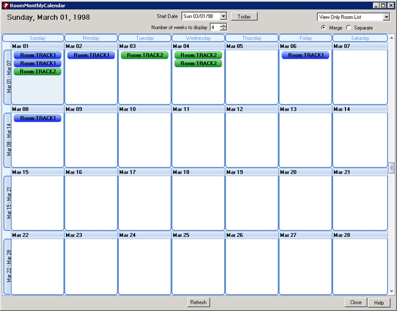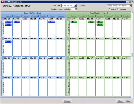 - These radio buttons control the format of the calendar and whether the rooms will be displayed in one calendar or separate calendars. Select Merge in order to display a single calendar with the reservations showing in a different color based on the room number. Select Separate if each room should display its own calendar in a split screen.